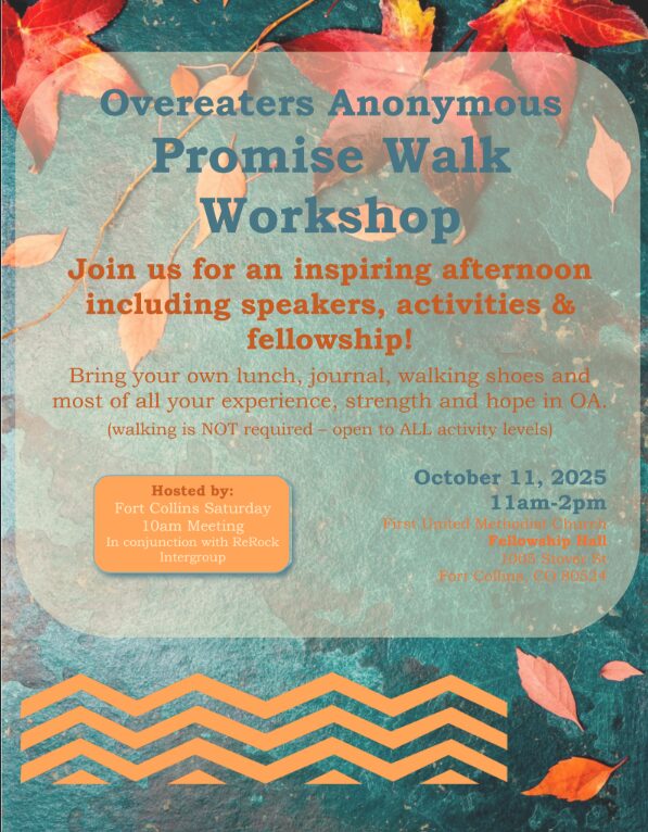 Bring your own lunch, journal, walking shoes and most of all your experience, strength and hope in OA (walking is NOT required – open to ALL activity levels)