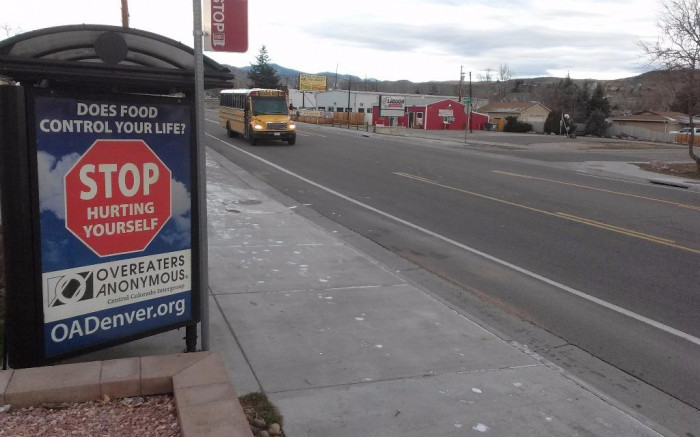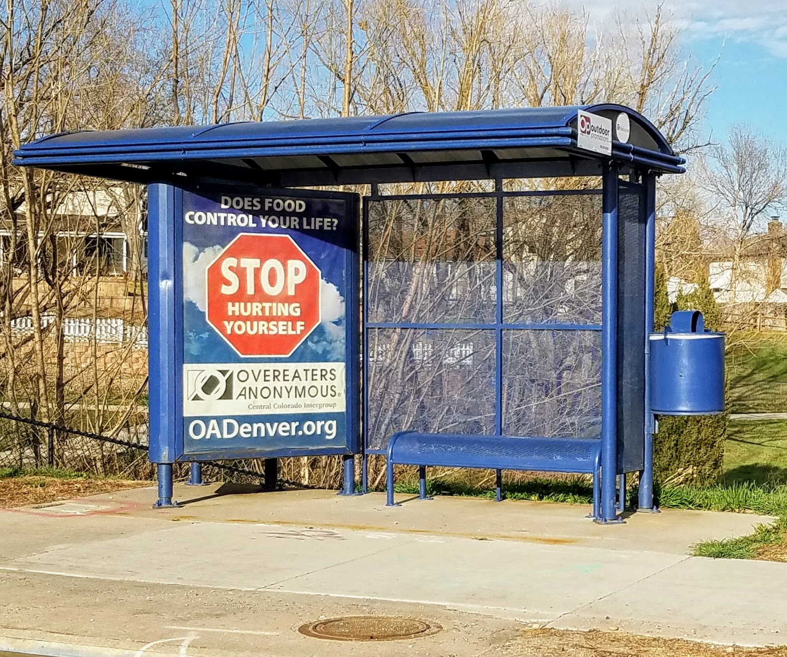 Thanks to you, and our strong members attending meetings and donating to our 7th tradition, Central Colorado Intergroup voted on a public information poster campaign to help bring more recovery to suffering compulsive overeaters. CCI partnered with RTD, to display 10 large OA posters around the Denver metro area at a very pivotal time of year- Dec. 14-Jan. 16–when many feel very lost and desperate around the holidays. These 10 curbside messages reached out to potential members looking to find a solution from their suffering. Bus shelter billboards are angled to traffic and reach an average of 200,000 viewers or sets of eyes per month. Let us know where you see one!